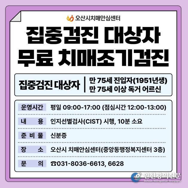 [인천광역신문] 최예준 기자 | 오산시치매안심센터는 치매의 조기 발견과 예방적 관리를 위해 관내 만 75세 진입자(1951년생) 및 만 75세 이상 독거 어르신을 대상으로 치매 집중검진을 실시한다고 밝혔다.