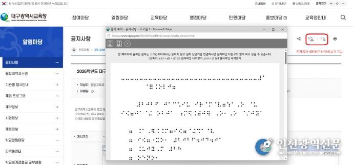[인천광역신문] 최예준 기자 | 대구시교육청은 4월부터 시각장애인과 저시력자 등 정보 취약계층의 정보 접근성을 높이기 위해 시교육청 대표 누리집에 ‘전자 점자 서비스’를 도입해 운영한다.