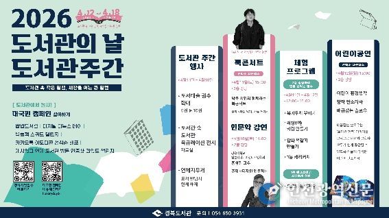 [인천광역신문] 최예준 기자 | 경북도서관은 제4회 도서관의 날(4월 12일) 및 도서관주간(4월 12일 ~ 18일)을 맞아 오는 4월 11일부터 18일까지 도민을 위한 다양한 독서 문화 행사와 체험 프로그램을 운영한다.