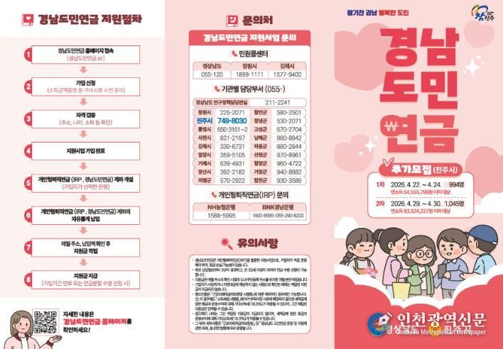 [인천광역신문] 최예준 기자 | 진주시는 지난 1월 ‘경남도민연금’ 모집 당시 접수 2일 만에 모집 인원 1001명이 조기 마감되는 등 시민들의 높은 정책 수요와 지속적인 추가 모집 요청을 적극 반영해 오는 22일부터 2039명 규모의 추가 모집을 시행한다고 밝혔다.