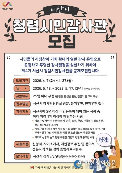 [인천광역신문] 최예준 기자 | 충남 서산시가 공정하고 투명한 감사행정 실현과 시민의 시정 참여 기회를 확대하기 위해 제4기 청렴시민감사관을 공개 모집한다고 밝혔다.