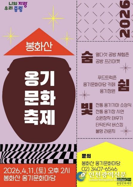 [인천광역신문] 최예준 기자 | 중랑구가 4월 11일 오후 2시, 신내동 봉화산 옹기문화마당에서 서울시 유일의 전통 가마를 활용한 ‘2026 봉화산 옹기문화축제’를 개최한다. 이번 축제는 작년에 개관한 ‘봉화산 옹기문화마당’의 운영과 전통 옹기가마 가동을 기념해 마련됐다.