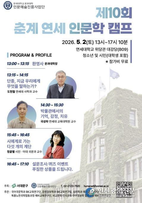 [인천광역신문] 최예준 기자 | 서대문구가 연세대학교 문과대학과 공동으로 5월 2일 오후 1시부터 5시 10분까지 연세대 위당관 대강당(B09호)에서 ‘제10회 연세 인문학 캠프’를 개최한다.