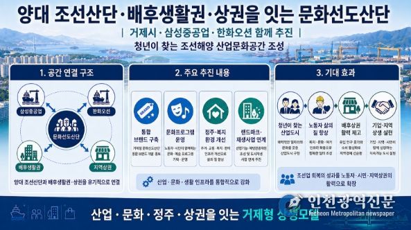 [인천광역신문] 최예준 기자 | 거제시가 삼성중공업, 한화오션과 체결한 지역상생발전 협약을 바탕으로 양대 조선산업단지와 인근 배후생활권, 지역상권을 함께 잇는 문화선도산단 조성사업 공모 준비에 본격 나선다.
