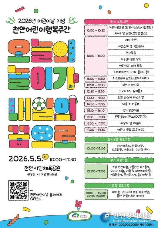 [인천광역신문] 최예준 기자 | 천안시는 제104회 어린이날을 맞아 5월 1일부터 5일까지 ‘2026 천안어린이 행복주간’을 운영한다고 28일 밝혔다.