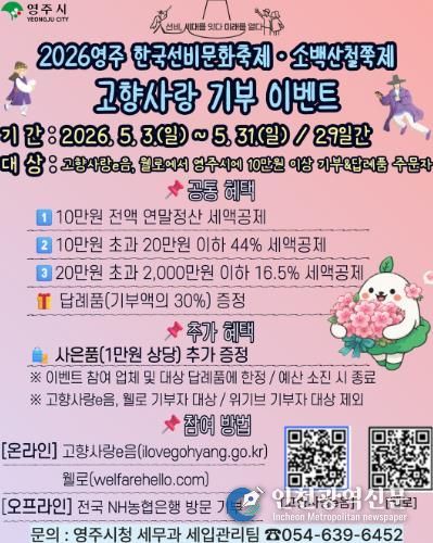 [인천광역신문] 최예준 기자 | 영주시는 5월 개최되는 '2026 영주 한국선비문화축제'와 '소백산철쭉제'를 맞아 고향사랑기부제 참여 확대를 위한 특별 이벤트를 운영한다.