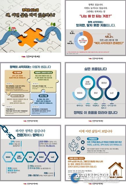 [인천광역신문] 최예준 기자 | 인천여성가족재단은 생애주기별 정책 사각지대 해소를 위해 2025년 수행한 연구보고서 '인천광역시 생애주기별 사각지대 지원 강화 방안 연구'를 바탕으로 카드뉴스를 제작·배포했다.