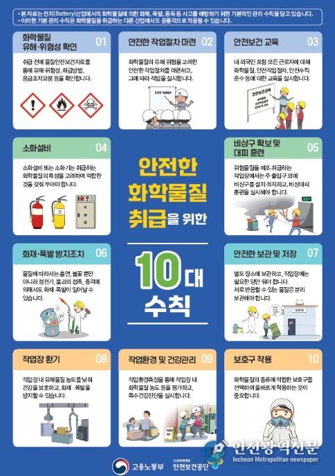 또한, ‘안전한 화학물질 취급을 위한 10대 안전수칙’을 배포하고, 한국배터리산업협회 등 관련 협·단체와 협업하여, 현장에서 10대 안전수칙이 철저히 이행될 수 있도록 안내·촉구할 예정이다.