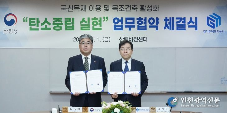 [인천광역신문] 관리자 기자 | 산림청과 경기주택도시공사(사장 김세용)는 서울 여의도 산림스마트워크 회의실에서 탄소중립을 실현하기 위한 국산 목재 이용 및 목조건축 활성화 업무협약(MOU)을 체결했다고 1일 밝혔다.