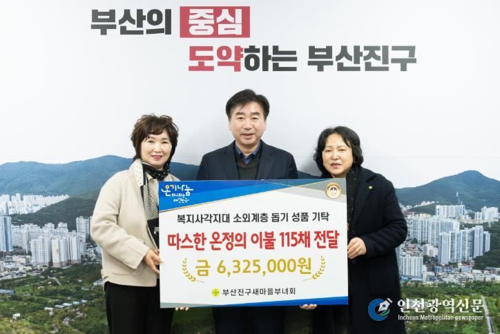 [인천광역신문] 관리자 기자 | 부산진구 새마을부녀회은 지난 23일 겨울철을 맞아 이웃들에게 따뜻한 마음을 전하기 위해 부산진구청을 방문하여 이불 115채를 전달했다.