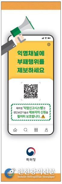 [인천광역신문] 관리자 기자 | 특허청은 부정부패행위 척결을 통한 청렴하고 투명한 공직문화 조성을 위해 이달부터 새로운 ‘익명신고시스템’을 도입·운영한다고 2일 밝혔다.