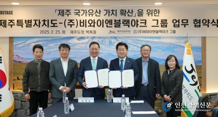 [인천광역신문] 관리자 기자 | 제주특별자치도는 25일 주식회사 비와이엔블랙야크 그룹과 국가유산 가치 확산을 위한 업무협약을 체결했다.