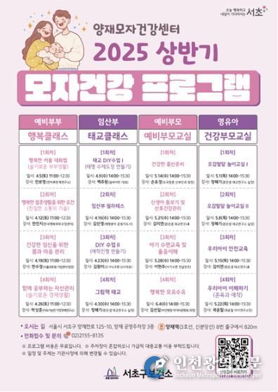[인천광역신문] 최훈 기자 | 서울 서초구가 이달 5일부터 양재모자건강센터에서 건강한 임신·출산·육아를 위한 ‘모자건강 프로그램’을 운영한다고 11일 밝혔다.