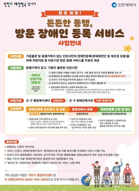 [인천광역신문] 최예준 기자 | 인천광역시는 복지 사각지대에 놓인 시민들을 위해 ‘든든한 동행, 방문 장애인등록 서비스 사업’을 확대 시행한다고 밝혔다.