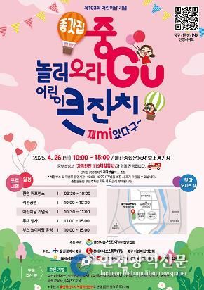 [인천광역신문] 관리자 기자 | 제103회 어린이날을 맞아 2025년 ‘종갓집 중구 어린이 큰잔치’ 행사가 오는 4월 26일 오전 10시부터 오후 3시까지 울산종합운동장 보조경기장에서 열린다.
