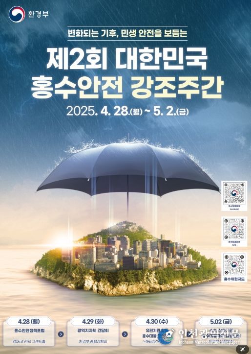 [인천광역신문] 관리자 기자 | 환경부는 올해 자연재난대책기간(5월 15일~10월 15일) 전 관계기관의 홍수대응 준비상황을 최종적으로 점검하기 위해 4월 28일부터 5월 2일까지를 ‘제2회 대한민국 홍수안전강조주간’으로 지정하여 운영한다고 밝혔다.