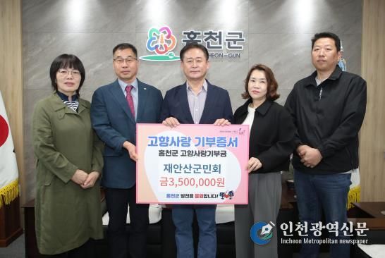 [인천광역신문] 관리자 기자 | 재안산홍천군민회 회원들은 5월 10일 홍천군청을 방문하여 고향인 홍천군 발전을 위해 고향사랑기부금 350만 원을 전달했다.