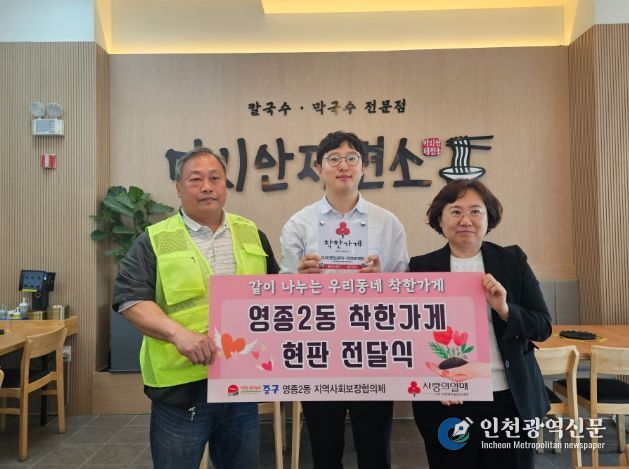 [인천광역신문] 최예준 기자 | 인천시 중구 영종2동 지역사회보장협의체는 최근 관내 소재 ‘마시안제면소 구읍뱃터 직영점(대표 박용하)’이 착한가게 정기 기부에 동참함에 따라, 착한가게 현판을 전달했다고 20일 밝혔다.