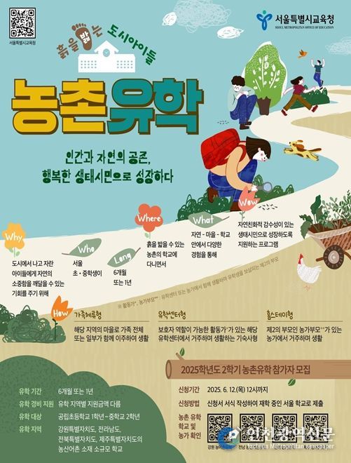 [인천광역신문] 관리자 기자 | 서울특별시교육청은 2025학년도 2학기 농촌유학 프로그램에 참여할 신규 학생을 오는 6월 5일부터 모집한다.