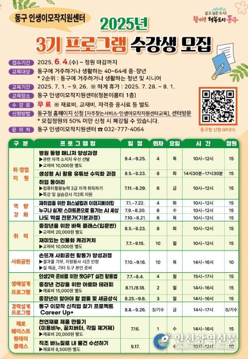 [인천광역신문] 최예준 기자 | 인천 동구는 2025년 3기 동구 인생이모작지원센터 프로그램 수강생을 6월 4일부터 모집한다고 밝혔다.