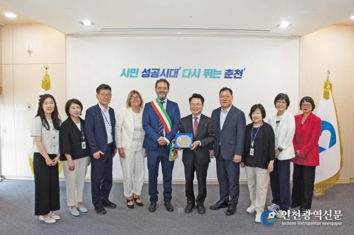 [인천광역신문] 관리자 기자 | 육동한 춘천시장이 9일 시청 접견실에서 이탈리아 파르마시 대표단을 접견, 파르마시의 천인의 만찬 공식 초청장을 받았다.