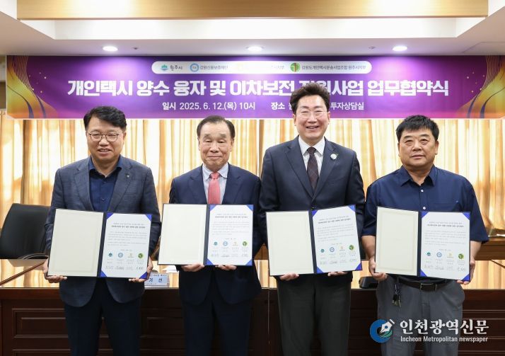 시는 12일 오전 10시 시청 7층 투자상담실에서 강원신용보증재단, NH농협은행 원주시지부, 강원도개인택시운송사업조합 원주시지부와 함께 ‘개인택시 양수 융자 및 이차보전 지원사업’ 업무협약을 체결했다.