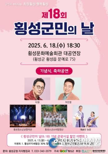[인천광역신문] 관리자 기자 | 제18회 횡성군민의 날 기념행사가 18일 오후 6시 30분, 횡성문화예술회관 대공연장에서 열린다.