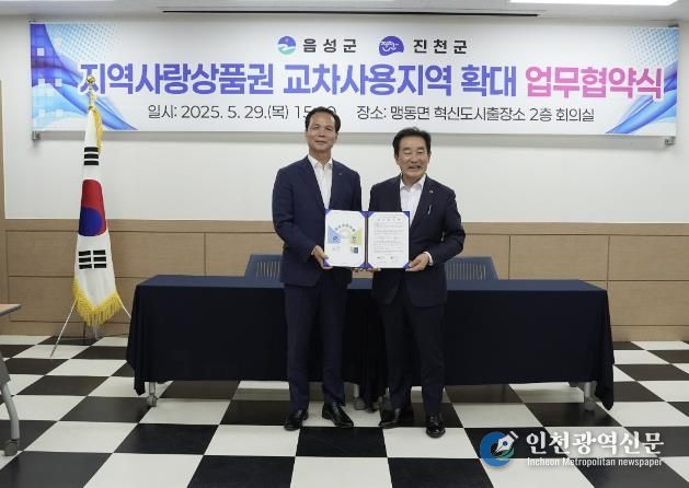 음성군과 진천군은 지난 5월 맹동면 혁신도시 출장소에서 지역사랑상품권 교차사용지역 확대를 위한 업무협약식을 갖고, 7월 1일부터 음성군 맹동면과 진천군 덕산읍 지역까지 지역사랑상품권을 공동 사용하기로 합의했다.