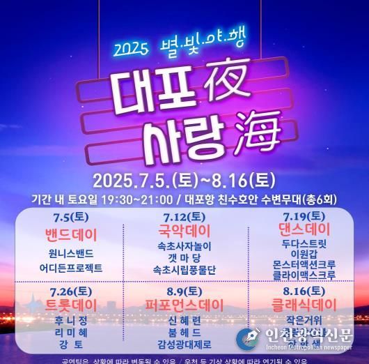 [인천광역신문] 관리자 기자 | 속초시가 여름밤의 낭만과 설렘을 담은 특별한 야외공연, ‘2025 대포夜 사랑海(대포야 사랑해)’ 콘서트를 오는 7월 5일부터 8월 16일까지 매주 토요일 저녁 7시 30분, 대포항 친수호안 수변무대에서 선보인다.