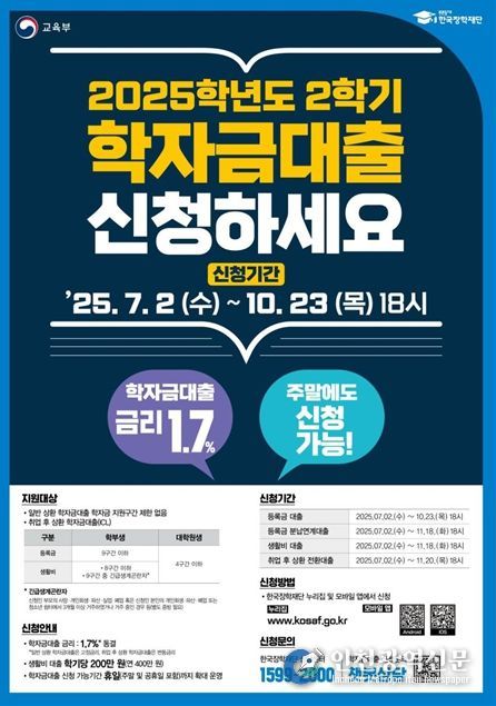 [인천광역신문] 관리자 기자 | 교육부와 한국장학재단(이사장 배병일)은 7월 2일부터 2025학년도 2학기 학자금 대출 신청·접수를 받는다.