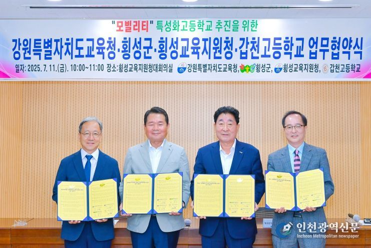 횡성군은 11일, 횡성교육지원청에서 강원특별자치도교육청(교육감 신경호), 횡성교육지원청(교육장 심영택), 갑천고등학교(교장 권상문)와 함께 ‘갑천고 특성화고 전환을 위한 업무협약’을 체결한다.