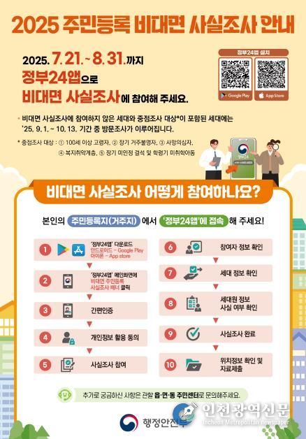 참여 방법은 간단하다. 스마트폰에 정부24앱을 설치한 후 ‘2025 비대면 주민등록 사실조사’ 메뉴에 접속해 본인인증을 진행하고 자신의 세대 정보 확인한 후 위치정보를 제출하면 된다.