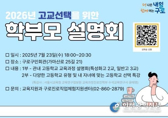 [인천광역신문] 최훈 기자 | 구로구가 7월 23일 구로구민회관에서 초등학교 5학년부터 중학교 3학년까지의 자녀를 둔 학부모를 대상으로 ‘2026 고교선택을 위한 학부모 설명회’를 개최한다.