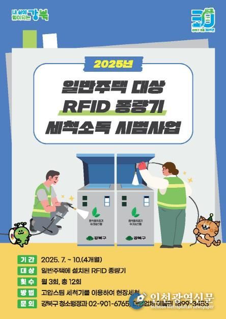 [인천광역신문] 최훈 기자 | 서울 강북구는 본격적인 여름철을 맞아 일반주택에 설치된 RFID 음식물 종량기의 위생관리를 강화하기 위해 이달부터 10월까지 ‘RFID 종량기 세척·소독 시범사업'을 진행한다고 밝혔다.