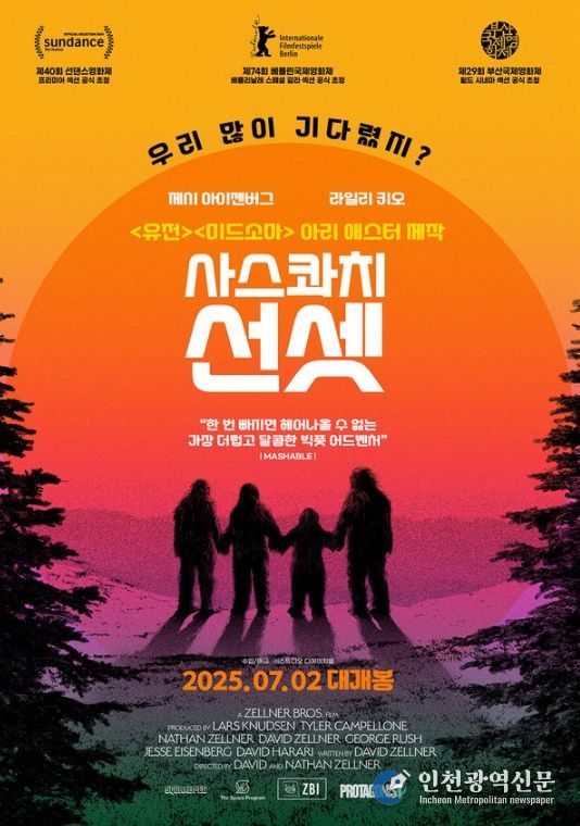[인천광역신문] 관리자 기자 | '유전''미드소마' 아리 애스터 감독이 총괄 프로듀서로 참여했으며, 선댄스, 베를린, SXSW, 부산을 발칵 뒤집은 귀여운 문제작 '사스콰치 선셋'이 7월 16일(수) 바로 오늘부터 극장 동시 IPTV & VOD 서비스를 시작한다.[감독: 데이비드 젤너, 나단 젤너 | 제작: 아리 애스터 | 출연: 제시 아이젠버그, 라일리 키오, 나단 젤너, 크리스토프 자야츠 데넥 | 장르: 코미디, 어드벤처 | 수입/배급: ㈜스튜디오 디에이치엘]