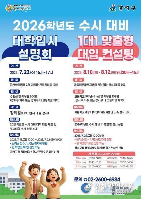 [인천광역신문] 최훈 기자 | 서울 강서구는 2026학년도 수시 대비를 위해 ‘대학입시 설명회’와 ‘1대1 맞춤형 대입 컨설팅’을 개최한다.