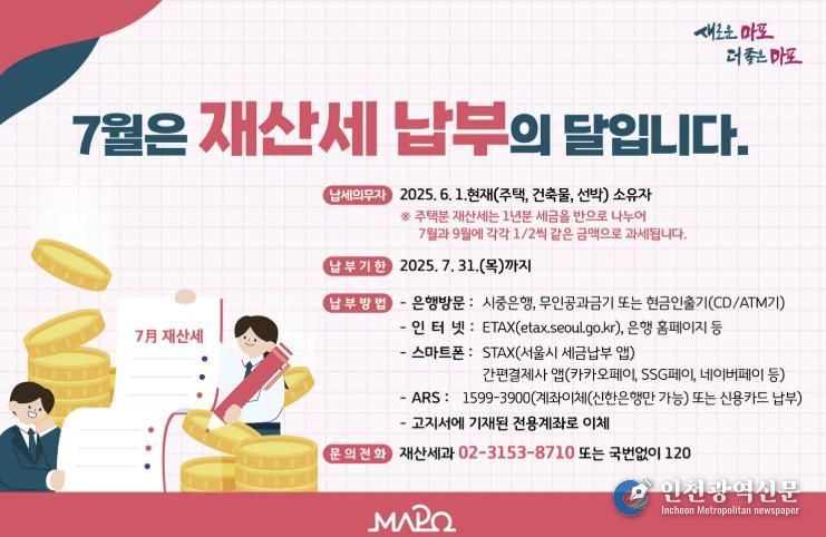 [인천광역신문] 최훈 기자 | 마포구는 7월 정기분 재산세 납부의 달을 맞아, 구민들이 기한 내 납부할 수 있도록 적극적인 홍보와 납부 독려에 나섰다.