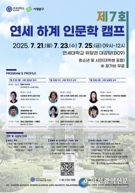 [인천광역신문] 최훈 기자 | 서대문구가 연세대학교 문과대학과 공동으로 이달 21일과 23일, 25일 오전 9시부터 정오까지 연세대 위당관 대강당(B09호)과 캠퍼스 일대에서 ‘연세 인문학캠프’를 개최한다. 이 행사는 2023년 1월 시작돼 이번에 7회를 맞았다.