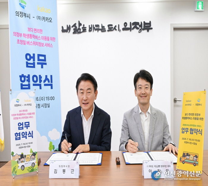 [인천광역신문] 관리자 기자 | 의정부시는 7월 16일 시장실에서 ㈜카카오와 ‘의정부 학생 통학버스 초정밀 위치정보 서비스 도입’을 위한 업무협약을 체결했다.
