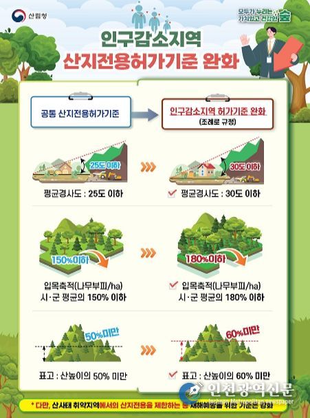 먼저, 평균 경사도는 인구감소지역은 기존 25도 이하에서 30도 이하인구감소외 지역은 27.5도 이하로 완화되고 산림 내 나무 부피를 나타내는 입목축적기준은 시군 평균의 150% 이하에서 인구감소지역 180% 이하, 감소외지역은 165% 이하로 완화된다.