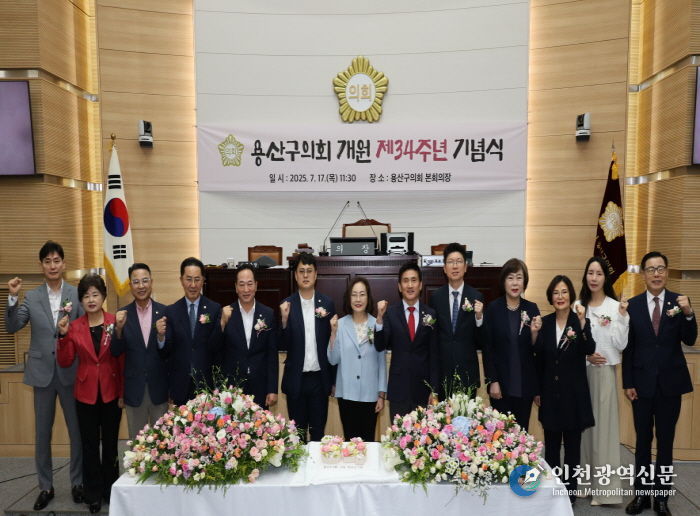 [인천광역신문] 최훈 기자 | 서울 용산구의회는 7월 17일 본회의장에서 ‘용산구의회 개원 34주년 기념식’을 열고 의정 성과를 돌아보며 향후 비전을 공유했다. 제299회 임시회 폐회 직후 열린 이날 행사에는 김성철 의장을 비롯한 의원들과 박희영 용산구청장, 집행부 공무원, 지역 언론인 등이 참석했다.