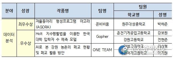 이외에도 ‘고퍼(Gopher)’팀은 ‘홀트(Holt) 지수평활법을 이용한 한국 대학 입학자 수 예측 모델’로, ‘원팀(ONE TEAM)’팀은 ‘인공지능(AI)으로 본 강원 농촌의 폐교 현황 및 폐교 활용 방안’으로 각각 우수상을 수상했다.