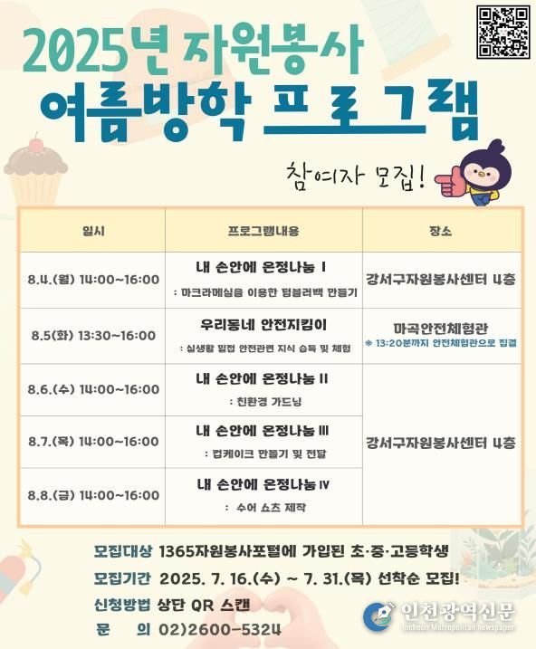 [인천광역신문] 최훈 기자 | 서울 강서구는 여름방학을 맞아 지역 청소년들을 위한 ‘2025년 자원봉사 여름방학 프로그램’ 참가자를 모집한다고 밝혔다.