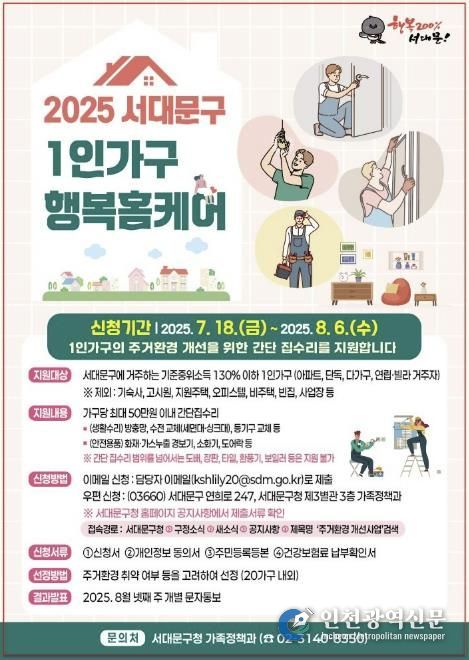 [인천광역신문] 최훈 기자 | 서대문구는 관내 1인 가구 내 소모품 교체와 간단한 집수리를 위해 ‘행복홈케어 사업’을 추진한다고 21일 밝혔다.