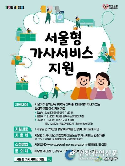 [인천광역신문] 최훈 기자 | 서울 은평구는 자녀를 양육하는 가정의 가사 부담을 줄이고 일과 가정이 조화를 이루는 환경을 조성하기 위해 ‘서울형 가사서비스 지원사업’ 추가 접수를 21일부터 시작한다고 밝혔다.