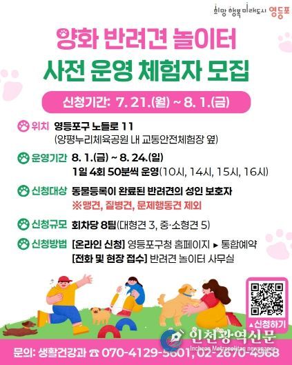 [인천광역신문] 최훈 기자 | 영등포구가 ‘양화 반려견 놀이터(가칭)’의 정식 개장에 앞서, 오는 8.1.까지 사전 체험단을 모집한다고 밝혔다.