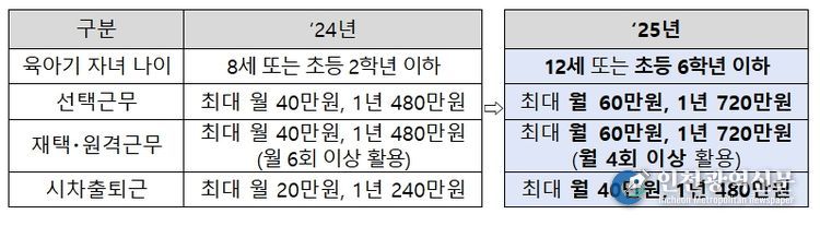 육아기 근로자의 자녀 나이 기준을 만 8세(초등 2학년)에서 만 12세(초등 6학년)로 확대하고, 육아기 자녀를 둔 근로자가 유연근무를 활용하는 경우 사업주에 대한 지원금을 일반근로자보다 두 배로 인상했다. 시차출퇴근을 활용하는 경우 근로자 1인당 월 최대 40만 원(1년 480만 원)을 지원받고, 선택근무나 재택‧원격근무 활용 시에는 근로자 1인당 월 최대 60만 원(1년 720만 원)을 지원받는다.