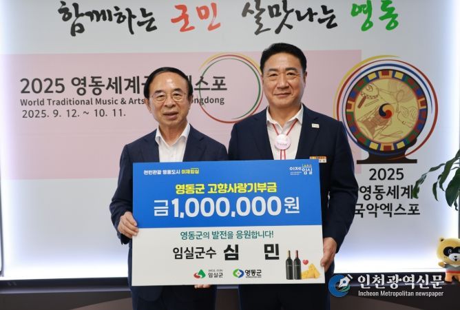 [인천광역신문] 관리자 기자 | 충북 영동군 자매도시인 전북 임실군 심민 군수는 지난 23일 영동군청을 방문해 고향사랑기부금 100만원을 기탁했다.
