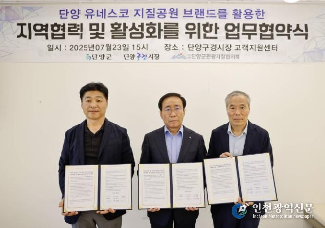군은 지난 23일 단양구경시장협동조합, (사)단양군관광지질협의회와 함께 ‘단양 유네스코 세계지질공원 브랜드를 활용한 지역협력 및 활성화’를 위한 3자 간 업무협약을 체결했다.