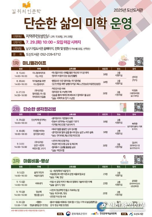 [인천광역신문] 관리자 기자 | 울산 남구 도산도서관은 문화체육관광부가 주최하고 한국문화예술위원회가 주관하는 ‘2025년 길 위의 인문학’공모사업에 선정돼 오는 8월 13일부터 9월 26일까지 지역주민을 대상으로 프로그램을 운영한다고 밝혔다.